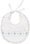 Babete rosa em tecido piqué com bordado floral no centro. À volta tecido folhado rosa que dá um toque ainda mais fofo.