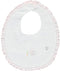 Babete de menina bebé rosa confecionada com tecido textura favo de mel. No centro, lindo estampado floral colorido com lacinhos rosa e borboletas. Ao redor da bebete renda branca com textura floral. Aperta atrás com mola.