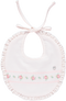 Touca de veludo vermelha com aplicação de folhos e renda à volta. A touca é presa por um laço do mesmo tecido.