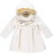 Casaco azul marinho com bordados nos punhos. Na frente, um macho de cada lado, com laço rosa aplicado. Um macho no centro das costas, com laço no topo. Todo forrado, o casaco fecha na frente com botões forrados.