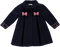 Casaco menina de malha azul marinho com fita de veludo estreita na barra em toda a volta do casado. Atrás tem 3 lacinhos de veludo aplicados e na frente os botões são forrados com o mesmo veludo. O casaco fecha na frente com botões internos.