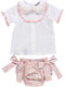 Conjunto de blusa com folho e detalhes azuis, conjunta com tapa-fralda verde florido com laços.