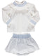 Conjunto de bebé rosa composto por uma camisola de malha com folhos na gola, touca, butins e calça.