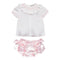 Conjunto de menina bebé com blusa de algodão branco e calções azuis. A blusa tem gola com estilo smock bordada com flores rosa e folhas verdes, para além de lindos folhos brancos. A manga curta tem renda branca com padrão às bolinhas à volta e aperta atrás com molas simples. Os calções de bebé, confecionados com tecido azul tem estampado de finas riscas brancas e corações, tem dois grandes laços feitos em cetim azul em cada um dos lados. As perneiras são elásticas com detalhe de renda azul à volta. Muito prático e elegante para a bebé.