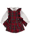 Conjunto de menina composto por macacão saia xadrez vermelho e camisa