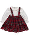 Conjunto de menina com macacão saia, apresentando barra estampada com ursos, que harmoniza com os punhos da camisa