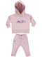 Conjunto de menina rosa, composto por hoodie com pelo no capuz e laço na parte inferior, com imagem centralizada no peito e detalhes espalhados pelas calças