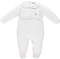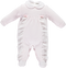 Babygrow rosa com peito trabalhado em nervuras e renda aplicada à volta. A gola é ondulada, com estampa floral, a combinar com os pés. Super confortável, aperta com molas nas costas e no fundo.
