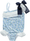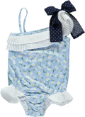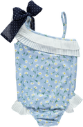 Fato de banho azul assimétrico para meninas. Feito em licra macia e elástica, tem um padrão de margarida azuis e acabamentos plissados brancos e um laço de chiffon azul-marinho fixo numa alça.