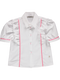 Descrição: Blusa branca com manga transparente, detalhes no punho. Aplicação na gola com rosas.