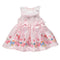 Blusa em algodão branca com ombros abertos e elásticos feitos com tecido bege com padrão floral colorido. Tecido que se repete na gola redonda e simples. O fundo da camisa é elástico, ajustando-se à cintura da menina. Aperta na frente com botões forrados em amarelo, vermelho e azul.