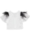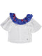 Blusa branca com folho floral amarelo. Detalhe de laço nas costas.