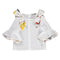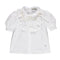 Blusa em algodão branca com ombros abertos e elásticos feitos com tecido verde com padrão floral colorido. Tecido que se repete na gola redonda e simples. O fundo da camisa é elástico, ajustando-se à cintura da menina. Aperta na frente com botões forrados em amarelo, vermelho e azul.
