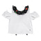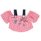 Blusa verde com riscas brancas com alças e ombros abertos. Lindo estampado na frente com flores rosa, azul e verde e grande laço às riscas rosa e branco. As alças são simples azul-marinho com dois botões forrados, com padrão floral colorido na frente. Leve, tem as mangas elásticas, assim como a linha do peito, que facilita o vestir.
