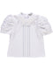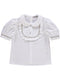 Camisa branca com nervuras na frente, botões cor salmão e mangas com tecido de flores salmão 3D e detalhes em cetim.