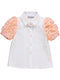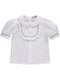 Camisa branca com gola peter-pan, com folho no centro e detalhes de renda de lurex dourada.