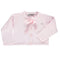 Casaco para menina bebé azul simples confecionado em malha de algodão tricotado. O decote é em V e tem dois lindos laços em cada lado dos ombros feitos com fita de cetim azul e diamantes no topo. Aperta na frente com dois botões em formato de pérolas azul.