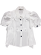 Blusa branca assimétrica com detalhes de nervuras e plissado nas mangas.