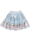Saia amarela com sobreposição de folhos, com padrão floral.