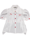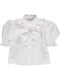 Descrição: Blusa branca com detalhes de folhos, manga balão com detalhes e franzido no punho. Botões rosa.