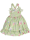 Vestido de menina verde com padrão de riscas e barquinhos e gola redonda franzida.
