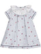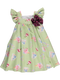 Vestido de menina verde com padrão de riscas e barquinhos e gola tipo gravata.