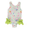 Fato de banho de menina azul simples com tecido com padrão de cupcakes, com flores, laços e corações. Dos lados lindos folhos azuis com laços. Tem forro para proteger a menina.