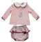 Este adorável conjunto para meninas bebés é simplesmente encantador. A camisola de malha azul-marinho com uma gola branca estilo Peter Pan com detalhes de pompons na borda e nos punhos elásticos é um toque de doçura. No centro da camisola, um estampado de um ursinho fofo adiciona um toque especial. O calção completa o visual com um folho decorado com pompons na borda, e cintura elástico que facilita o vestir. Este conjunto é uma escolha perfeita para manter seu bebé confortável e com muito estilo.