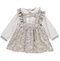 Este adorável conjunto para meninas bebés apresenta uma blusa branca com uma gola redonda, embelezado com um lindo detalhe de tecido floral rosa na borda. A saia jardineira floral rosa tem alças ajustáveis que se cruzam nas costas, adicionando um toque encantador ao conjunto. Está totalmente forrado para o conforto da sua menina.