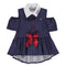 Saia-calção em tons de rosa com padrão floral. Tem duas camadas, uma interna que fazem os calções em corte simples, e outra camada externa que cria a saia fluída com folhos em camadas. Na cintura grande laço na frente confecionado com o tecido principal. Aperta de lado com fecho invisível e botão e tem cintura elástica com botão que ajusta a cintura à menina.