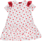 Vestido de menina azul com estampado de pequenas flores, gola peter-pan, detalhe de renda nas mangas, nervuras no peito e dois laços aplicados.