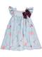 Vestido de menina azul com detalhe de gola franzida em renda.