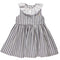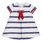 Vestido branco sem alças com padrão floral para menina bebé. O tecido macio branco tem flores nas cores azul e rosa com pequenas folhas verdes, distribuídas por todo o tecido. Detalhe de chapinha do lado esquerdo do peito com iniciais da marca. Na parte de trás dois laços grandes feitos em fita gorgurão azul que se sobrepõem a um tecido branco liso com folhos em cor verde no fundo, feitos em camadas com detalhe de renda azul na borda. Todo forrado para conforto do bebé, aperta atrás com fecho invisível.