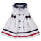 Vestido sem mangas para menina bebé em tecido às riscas castanho e branco. A gola é branca simples e redonda com um bordado à volta em ponto aberto. O corpete ajusta-se ao corpo e tem um detalhe de pequena chapa com as iniciais da marca no lado esquerdo. Na cintura, atrás do vestido, grande laço branco ajustável que cai sobre a saia volumosa. Todo forrado para melhor conforto da menina, aperta atrás com fecho.