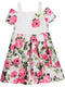 Vestido de menina rosa em tecido às bolas, como detalhe de gola plissada e grande laço nas costas.