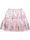 Vestido rosa com bordados, detalhe de flores na cintura, renda nas mangas, decote e laço rosa nas costas.