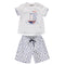 Conjunto menino com t-shirt orgânica de malha branca com botões forrados, bolso azul às riscas e carimbo da marca no lado esquerdo do peito. Os calções são brancos e azuis com riscas e têm um carimbo feito com máquina fotográfica com a palavra vivre la vie do lado esquerdo. A cintura é elástica e ajustável com cordão azul-marinho.