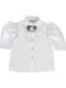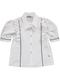 Descrição: Blusa branca com folhos e vivos contrastantes rosa. Botões contrastantes.
