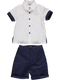 Conjunto de menino beige, composto por calção beige com barra italiana, com camisa branca com detalhes nas mangas.