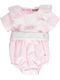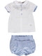 Conjunto de menino beige composrto por calção com vivos brancos e camisa com detalhes de nervuras e renda, com botões falsos e gola peter-pan. Camisa fecha nas costas através de molas.