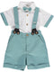 Conjunto de menino verde e branco. Composto por calção com suspensórios e camisa branca com detalhe de fita contrastante nas mangas.