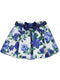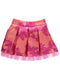 Saia rosa com pregas macho e padrão floral. Cinto rosa com laço.