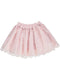 Saia branca franzida na cinta com detalhes de renda azul.