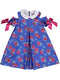 Vestido amarelo com padrão floral e prega macho no centro. Detalhe de gola branca contrastante, manga recortada e detalhes de laços na manga.