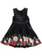 Vestido de menina preto com corte princesa, detalhe de penas na gola e tecido contrastante às bolas.