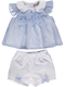 Conjunto de menina verde composto por top verde com gola branca, dois laços na frente e com folhos nos ombros. Conjunta com calção branco com dois laços verdes na bainha. Tecido florido.