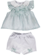Conjunto de menina azul composto por blusa branca (com abotoamento nas costas), com gola azul e detalhes de folhos rendados nas cavas. Conjunta com cueca azul com folhos e dois laços grandes nas laterais.