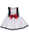 Vestido de menina branco com pala marinheiro e espiguilha azul marinho. No peito lacinhos vermelhos sobrepostos. Logótipo em madrepérola. Totalmente forrado, com fecho nas costas. Um vestido fresco e cómodo com um toque tradicional, ideal para o verão.
