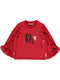 Camisola vermelha com estampado no centro, golas e punhos com folho em tecido tartan bege.