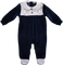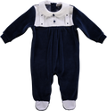 Babygrow de menino marinho e branco com gola peter-pan e detalhes bordados.